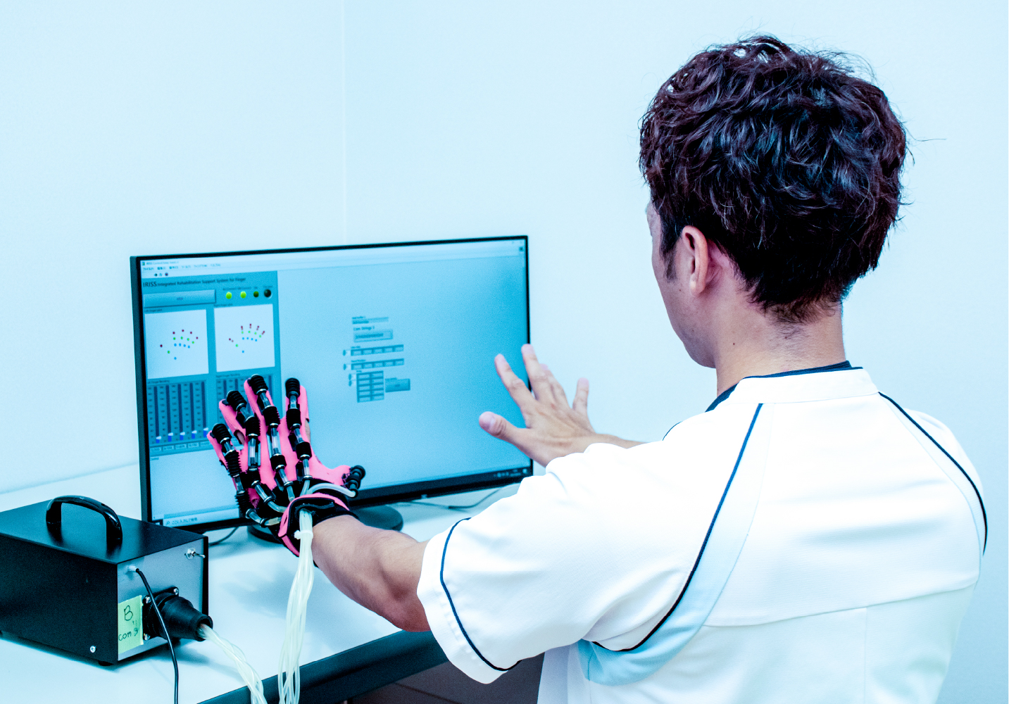 大学等のさまざまな教育機関、医療機関や民間企業、研究者らと共同開発、共同研究を実施しており、開発した機器等をリハビリテーションに活かしています。