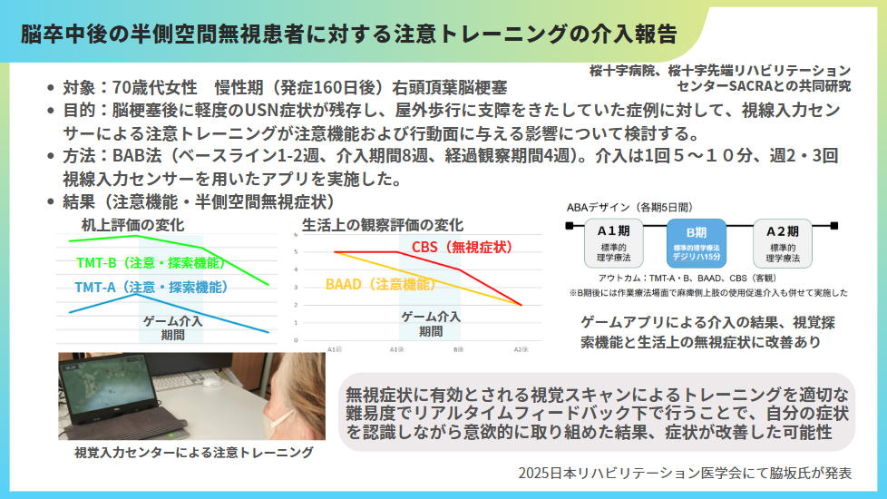 」というテーマで、症例報告ではありますが半側空間無視患者に対する注意トレーニングの介入効果を発表しております。