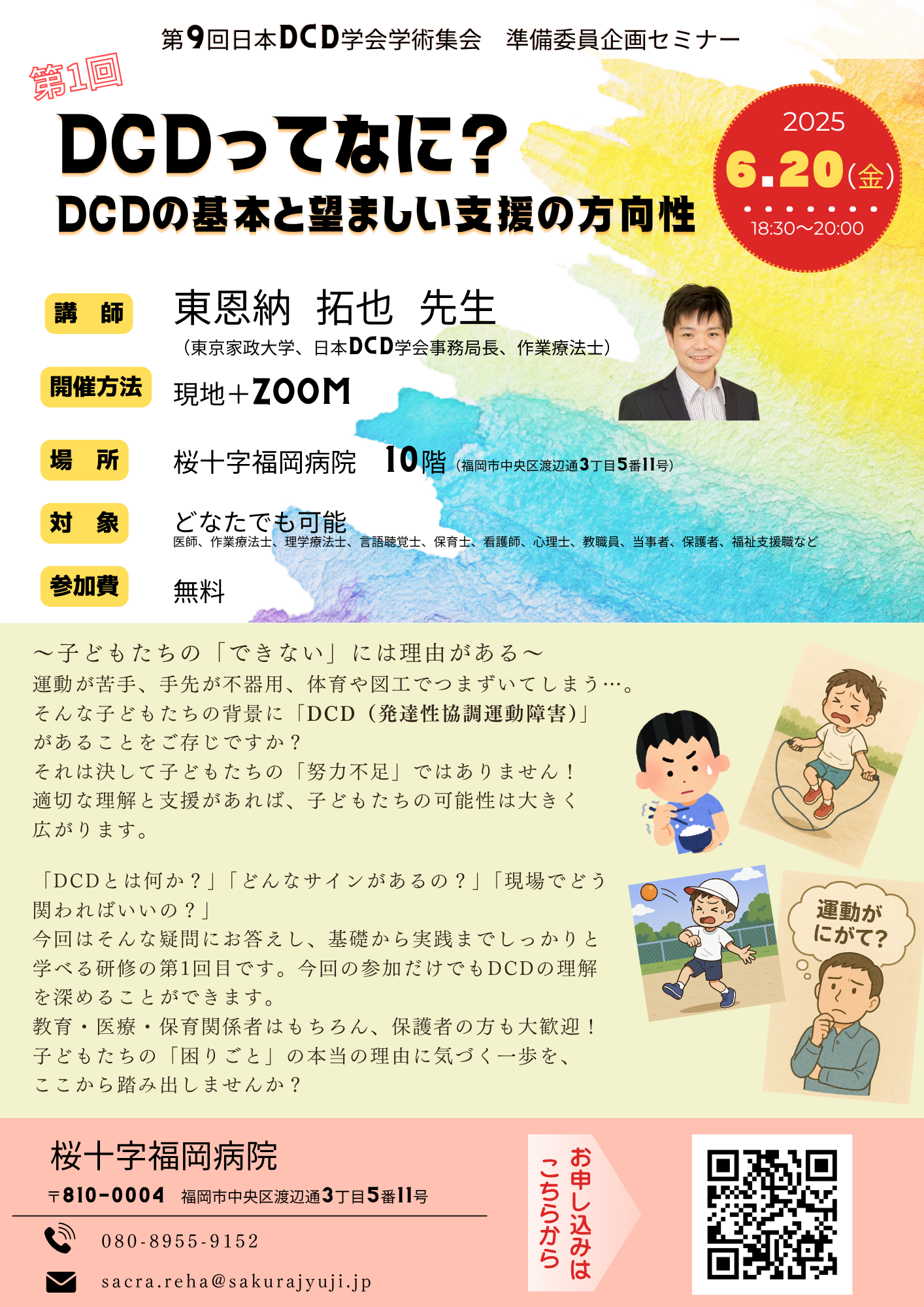 6月20日(金)18時半~ 桜十字福岡病院にて、第9回日本DCD学会学術集会・準備委員企画セミナーを開催致します。