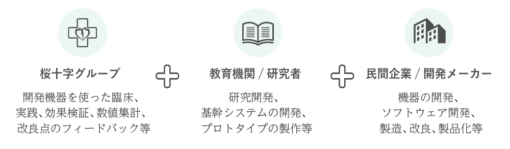 桜十字は、桜十字先端リハビリテーションセンター(Sakurajyuji Advanced Center for Rehabilitation Approaches:SACRA)という研 究機関を有しており、多くの企業、大学等と共同開発、共同研究を行い、世の中にない新たなリハビリテーション機器を生み出しています。