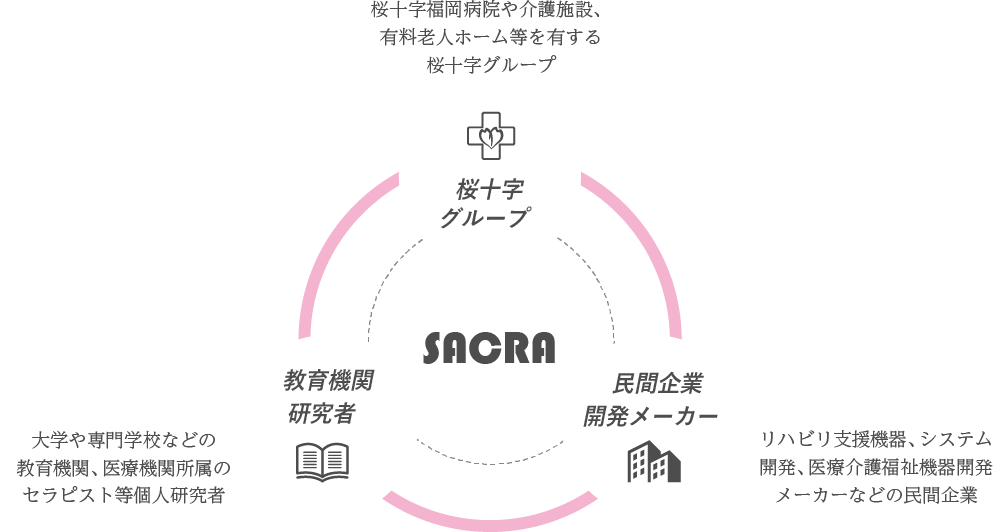 SACRA は、医療機関や個人の研究者・教育機関、 民間企業が交わり合い、新たな価値を創造する場を提供します。